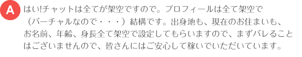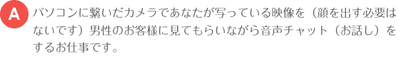 会話になりますので、画面越しにお喋りをするだけのとても安全なお仕事です! バーチャルの世界を楽しんじゃいましょう!