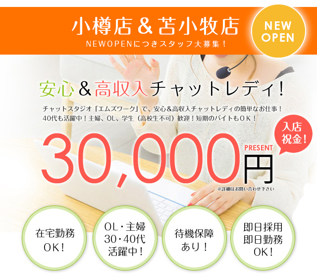 | 札幌のライブチャットスタジオ「エムズワーク」で、安心&高収入チャットレディの簡単なお仕事!40代も活躍中!主婦、OL、学生(高校生不可)歓迎!短期のバイトもOK! |